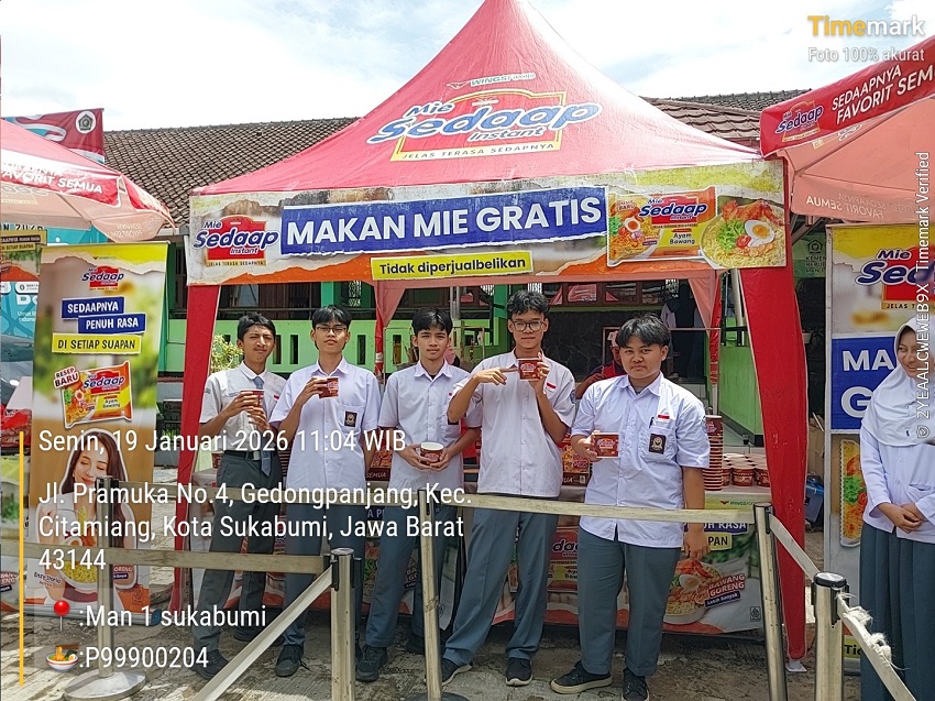 MAN1Si - Citamiang - Untuk yang kedua kalinya, setelah sebelumnya dilaksanakan pada Oktober 2025, MAN 1 Kota Sukabumi kembali bersinergi dengan Mie Sedaap yang diproduksi oleh Wings Food melalui PT Karunia Alam Segar dan PT Prakarsa Alam Segar, dalam kegiatan pembagian mie cup gratis kepada para siswa. Kegiatan ini dilaksanakan pada Senin (19/01/2026), bertempat di Lapangan Utama MAN 1 Kota Sukabumi, dengan total 280 porsi Mie Sedaap siap santap.